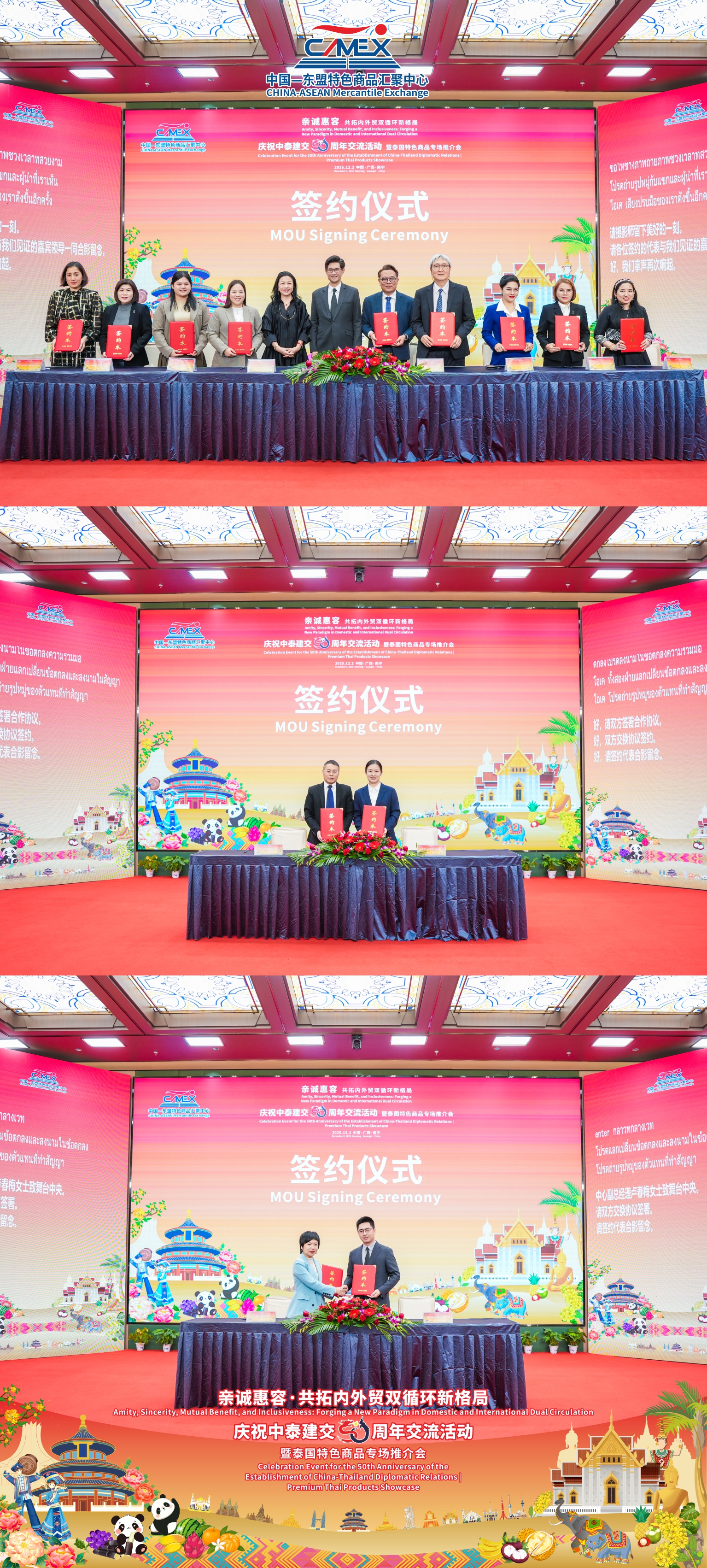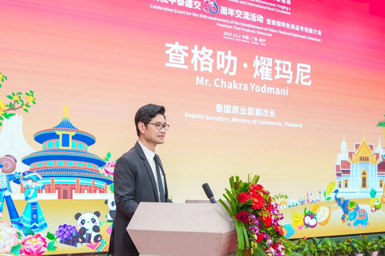 12月2日,“亲诚惠容·共拓内外贸双循环新格局——庆祝中泰建交50周年交流活动暨泰国特色商品专场推介会”在中国—东盟特色商品汇聚中心隆重举办。本次活动由泰国商业部、泰国商业部国际贸易促进司、中国国际贸易促进委员会广西壮族自治区分会、中国—东盟商务理事会联席秘书处、中国—东盟特色商品汇聚中心(简称“汇聚中心”)联合主办,中国国际商会广西商会、中国检验认证集团广西有限公司、广西达译科技有限公司、迈越科技股份有限公司、方圆标志认证集团广西有限公司作为支持单位参与此次活动。
