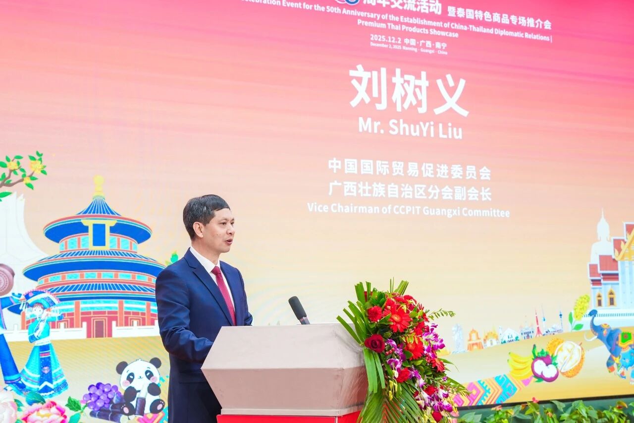 刘树义副会长在致辞中表示, 广西始终把深化桂泰合作作为服务国家战略的重要抓手,稳步把“中泰一家亲”的理念转化为实实在在的合作成果。他希望以中泰建交五十周年为契机,深挖中国—东盟自贸区3.0版和RCEP的政策红利,以本次活动为起点,以“特色商品”为纽带,推动更多泰国水果、香米、手工艺品等特色商品通过广西的跨境电商平台走进中国千家万户,同时也鼓励中国的机械设备、电子产品、轻工产品借助泰国市场辐射整个东盟。在此基础上,桂泰合作必将迈上新的高度。
