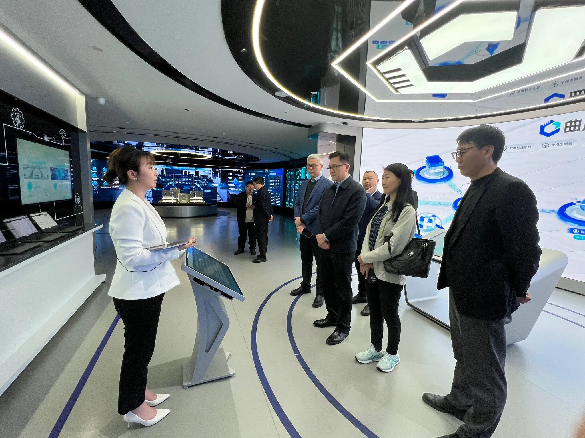 孙局长到中国—东盟国家人工智能应用合作中心展示中心调研,并参观中心的展示厅。该中心是由广西壮族自治区与东盟国家共建的人工智能合作平台,旨在推动区域人工智能技术合作与产业数字化转型,亦是面向东盟的产业高地。